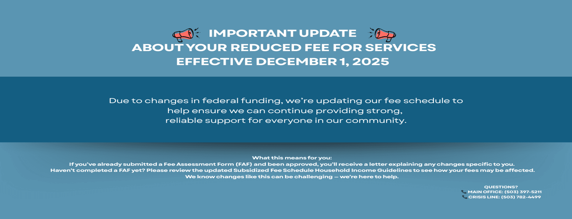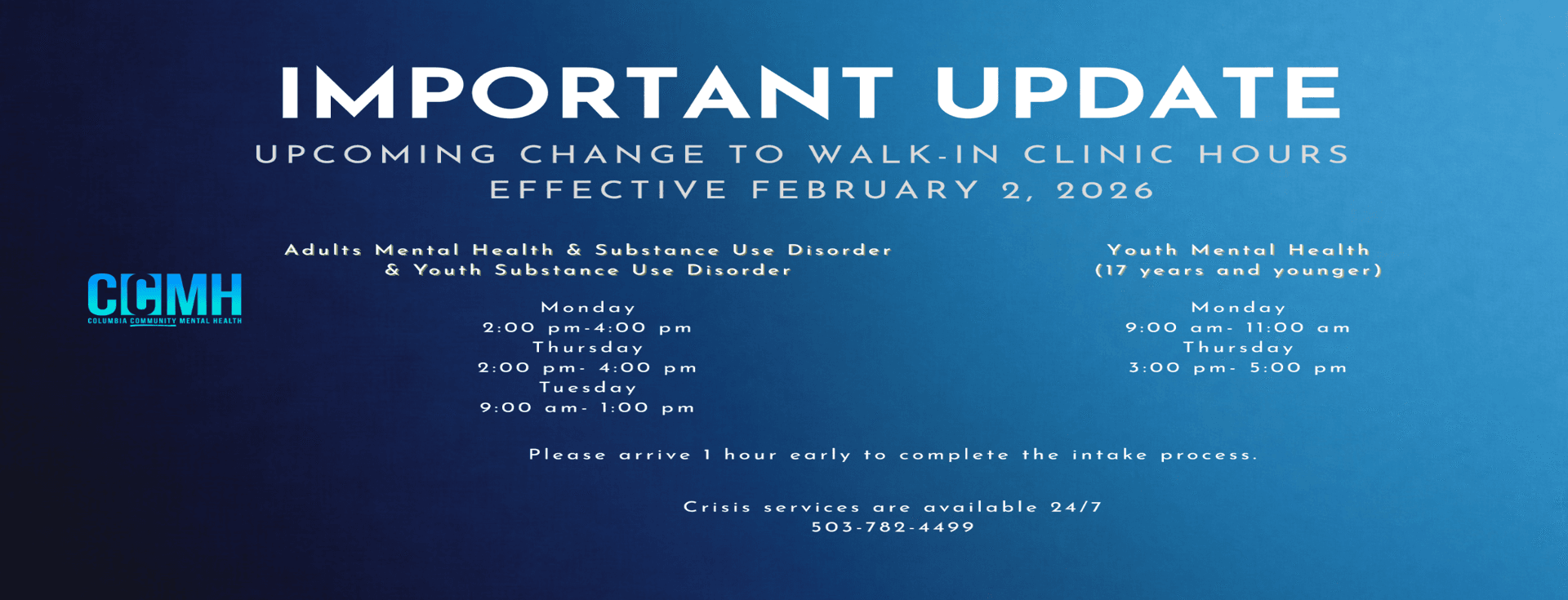 Columbia Community Mental Health acknowledges that its facilities are located on lands traditionally inhabited by the Clatskanie, Cowlitz and some Kalapuya speaking nations and other indigenous peoples.